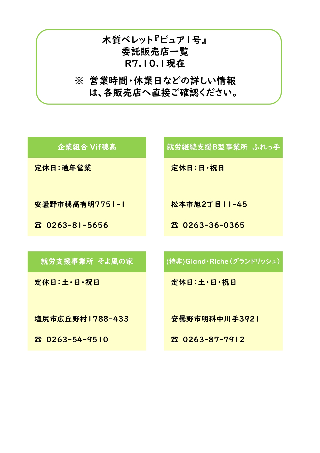 ※ペレットの販売は委託販売先で行っています。営業時間・休業日などの詳しい情報は委託販売先へ直接ご確認ください。